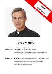 Eine herzliche Einladung ist an alle Gemeindemitglieder und Interessierten gerichtet: Um 18.00 Uhr wird Bischof Heiner in St. Marien eine heilige Messe feiern, anschließend besteht die Möglichkeit zu einer kurzen Begegnung.
